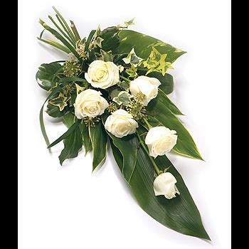 A classic and elegant sheaf of roses and complementary foliage tied with a ribbon.