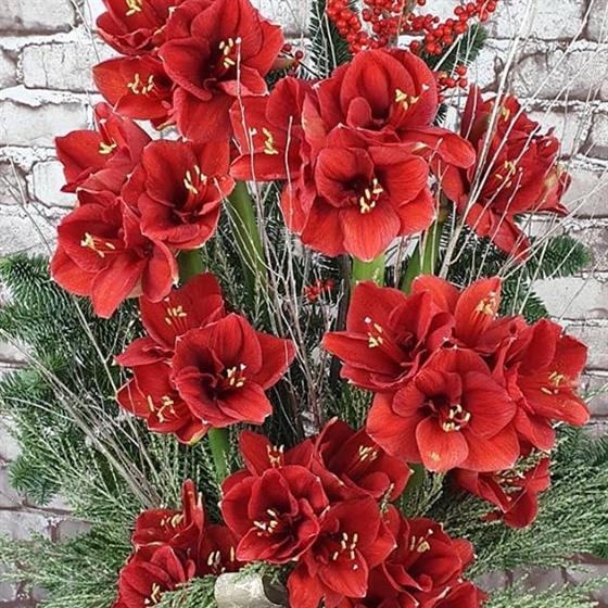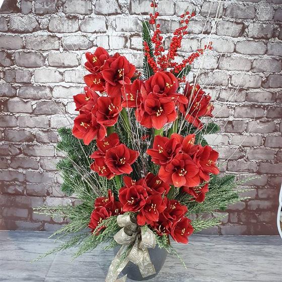 Add heaps of festive magic with this stunning display of Red Amaryllis, Berries, Festive Foliage and a Christmas Bow.