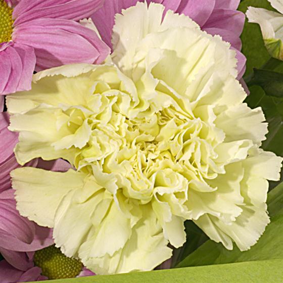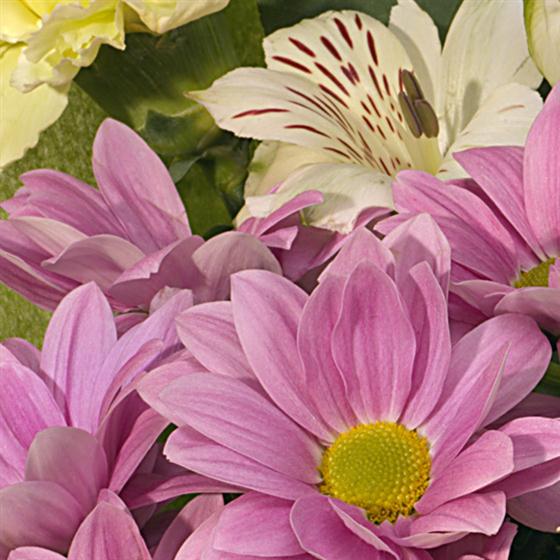 A delicious mix of purple Chrysanthemums, Prado Carnations, white Alstroemeria and white Roses.
