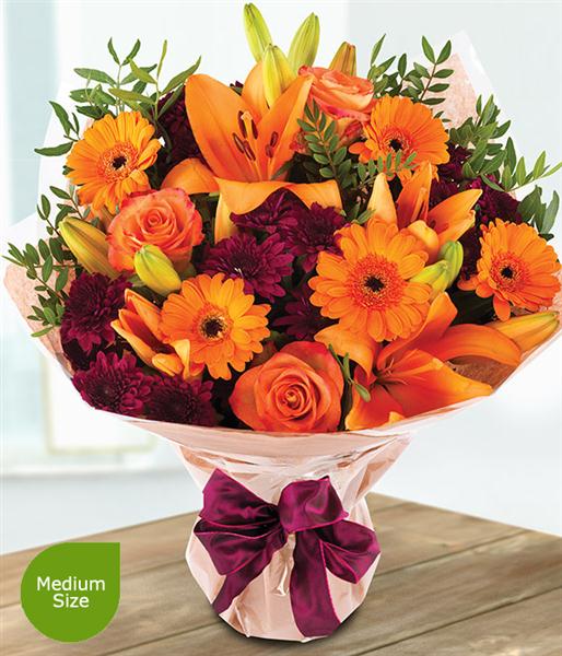 A sumptuous autumnal bouquet inspired by the colours of the season. Deep burgundy Spray Chrysanthemums sit perfectly amongst a glorious display of orange Roses, Lilies and Germinis.