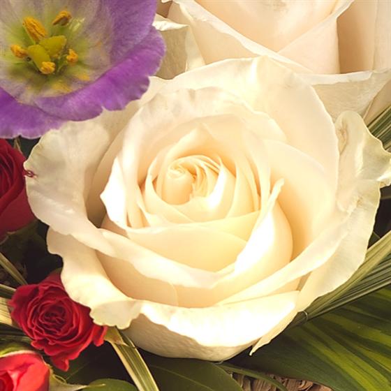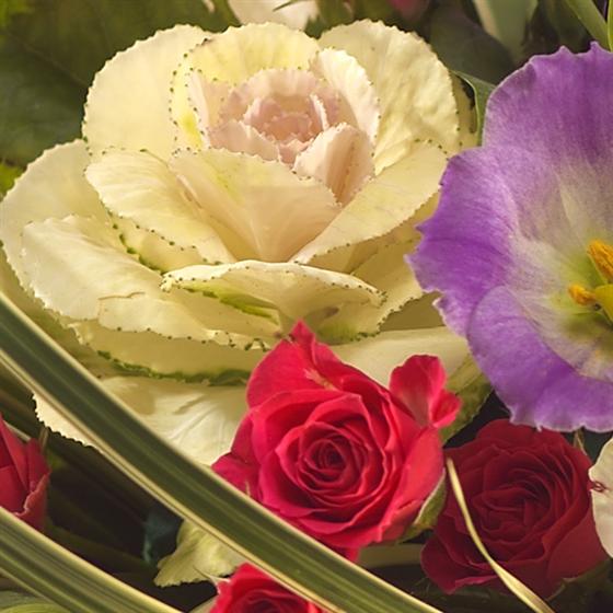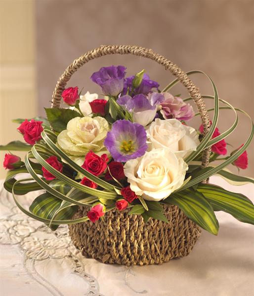 This chic and stylist basket containing Brassica, spray Roses, Carnations, Lisianthus, Roses and elegant foliage.