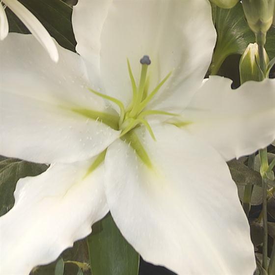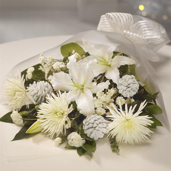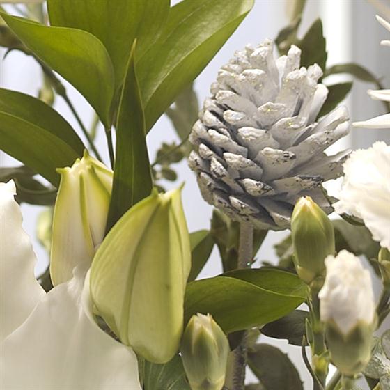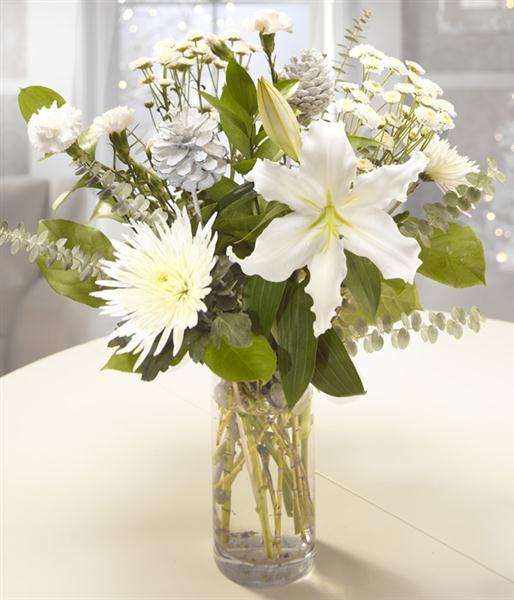 A pure white Lily is the star, perfectly nestled alongside glorious white Bloom Chrysanthemums and delicate Spray Carnations. White Pine Cones complete this cool crisp Christmas flower gift.