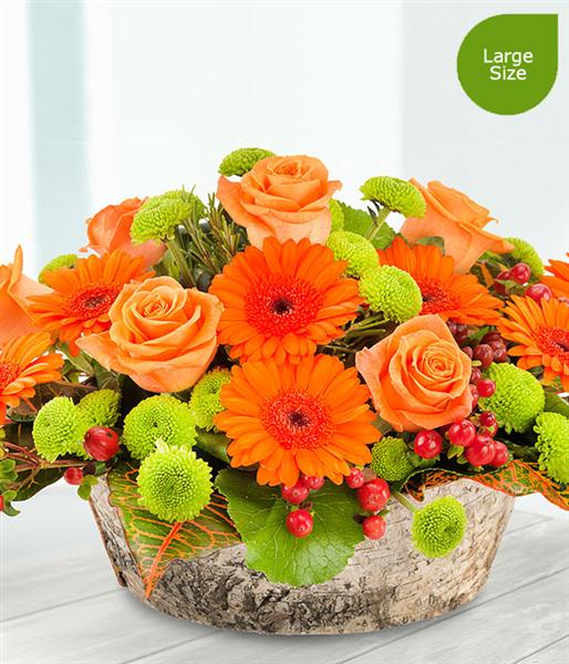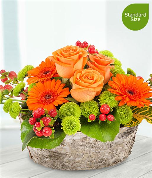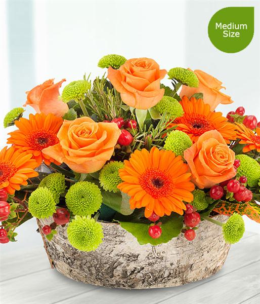 A simply sumptuous flower arrangement. Orange Roses and Germini, mixed with green Spray Chrysanthemums and red Hypericum Berries beautifully presented in a silver bark pot.