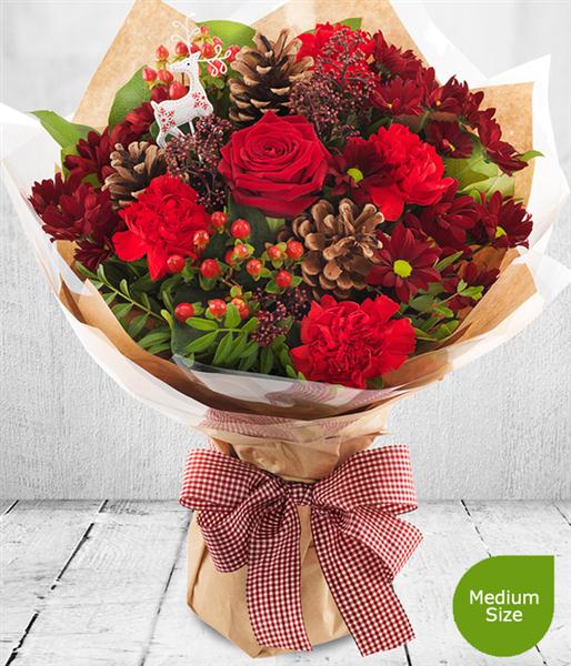 We've got Christmas all wrapped up with this pretty Aqua-pack Bouquet. A single white deer is nestled in amongst an array of rich red Roses, Chrysanthemums, Carnations, pine cones and berries.