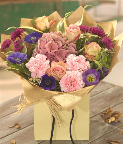 Vintage in style, this delightful aqua packed floral gift bag is simply packed with Roses, Hydrangea, Lisianthus, Chrysanthemums and Carnations.