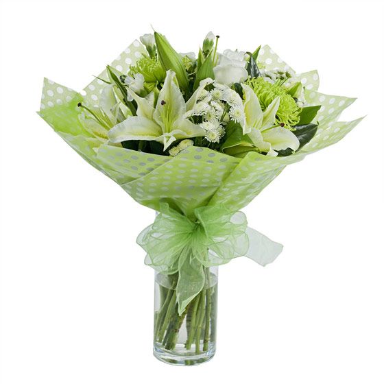 Exquisite flowers, Anastasia Blooms, White Lilies, Akito White Roses, White Spray Carnations, Stallion Chrysanthemum and Assorted Foliage delivered hand-tied.