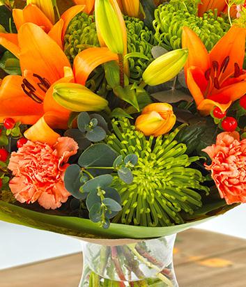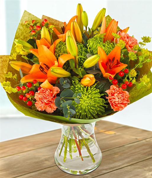 A gloriously bright, autumnal flower vase arrangement. Orange Lilies and Carnations simply zing against the glorious green Chrysanthemum blooms. Pretty red Hypericum Berries add the perfect finishing touch. Glass vase included.