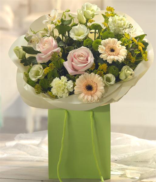 A delightfully delicate Mother's Day flower gift bag bouquet. Pretty pink Roses are neatly nestled alongside pure white Alstroemeria and Lisianthus. Peach Germini, green Chrysanthemums and Carnations complete this fragrant gift.