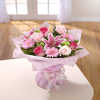 Pretty in pink hand-tied delivered in water featuring Lilies, Roses and Germini.