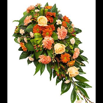 A beautiful orange and peach single ended spray. Roses, Chrysanthemums, Carnations and bronze Hypericum sit perfectly alongside variegated red and lime Dracaena, Aralia leaves, Cocculus, Salal and Cherry Blossom.