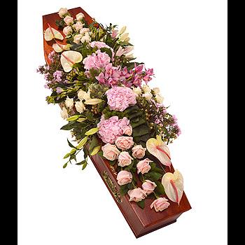 A pretty and delicately fragrant casket spray. Cream and pink Roses, pink Cymbidium Orchids, Hydrangea, Phlox, Lilies and Hypericum with purple Freesia and cream Anthuriums sit amongst a generous mix of Anthurium and Aspidistra leaves.