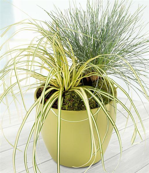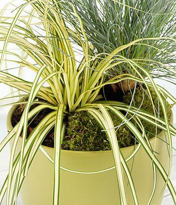 Two grass plants in a lime green ceramic pot filled with Bun Moss.