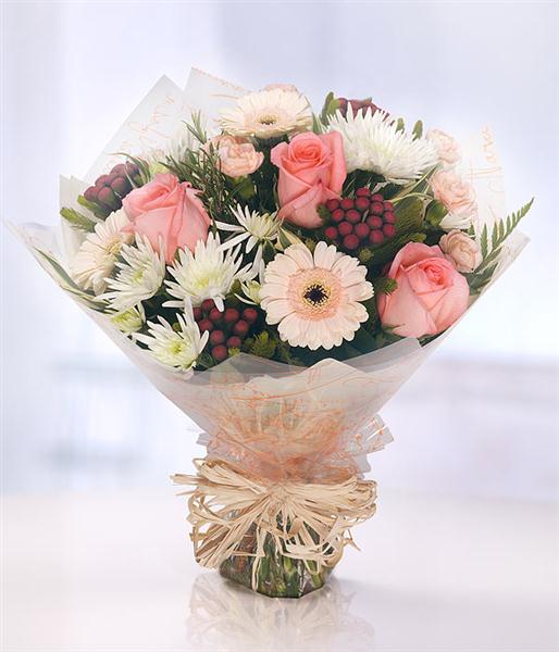 A charming hand-tied bouquet of peach and cream flowers including Roses, Mini Gerbera, Carnations and Chrysanthemums complemented by rich green foliage and complementary packaging. The bouquet is supplied in an aquapack for instant display.