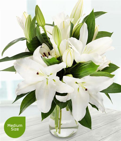 A stunning display of pure white Lilies in a clear glass vase. A true classic.
