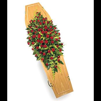 A stunning red Rose casket spray. Accompanied by Moluccella blooms, green Hypericum and an array of luscious green foliage.