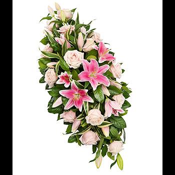 A beautiful pink Rose and Lily double ended spray with foliage.