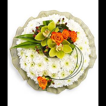 A white Chyrsanthemum based posy pad with a spray of orange Roses, green Cymbidium Orchids and bronze Hypericum neatly finished with a hessian trim.