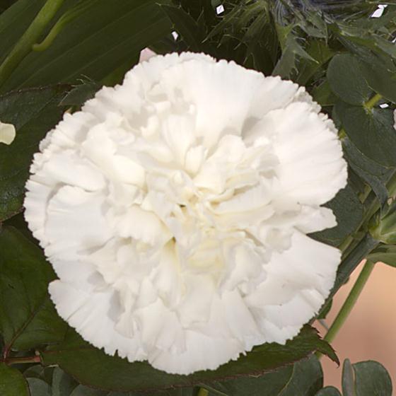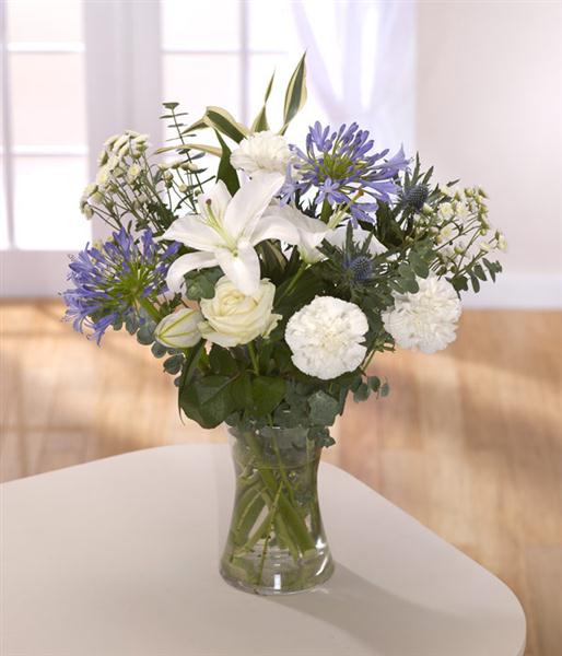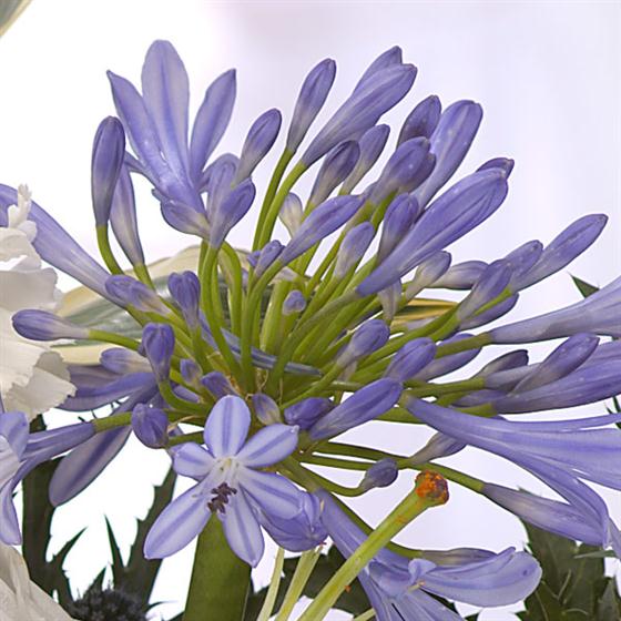 This bouquet features white Lilies, Roses and Chrysanthemums, highlighted with blue Agapanthus and Eryngium.