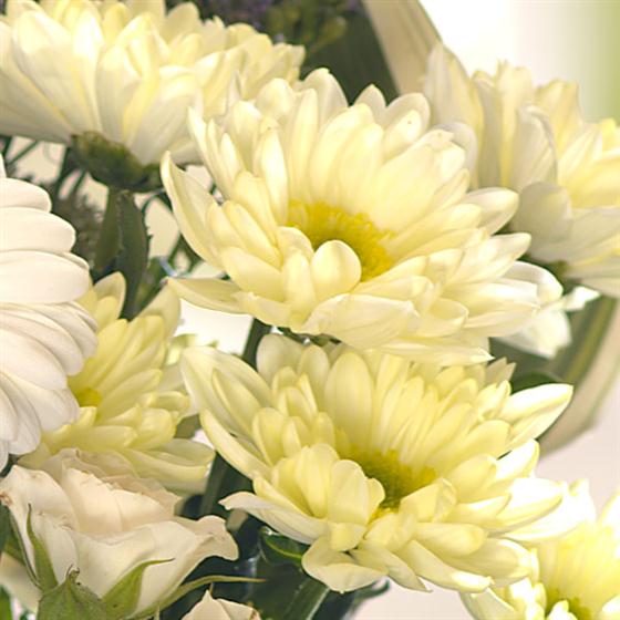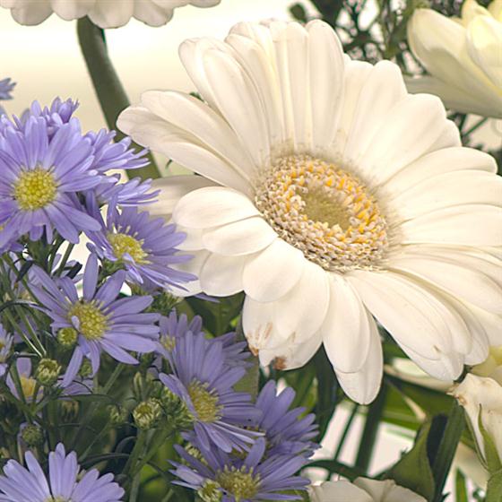 The lemon, cream, white and blue hues of these roses, asters and chrysanthemums combine to form a very pretty vase arrangement.