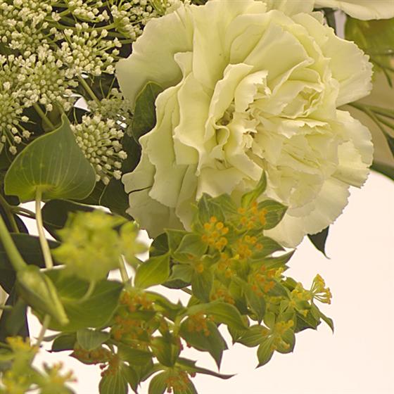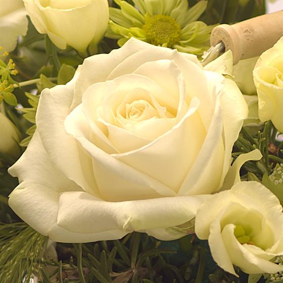 A beautifully cool summer colour combination of Roses, Lisianthus, Chrysanthemums and foliage, presented in a lovely cream flower bucket.