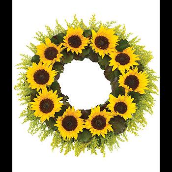 A beautifully bright Sunflower wreath with yellow Solidago and Galax Leaf trim.