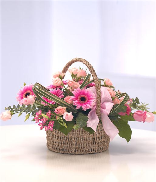 A classic basket arrangement in shades of pink, containing Germini, Bouvardia, Spray Roses, Lisianthus, China Grass and foliage - an ideal gift to celebrate the birth of a new baby girl.