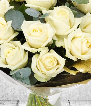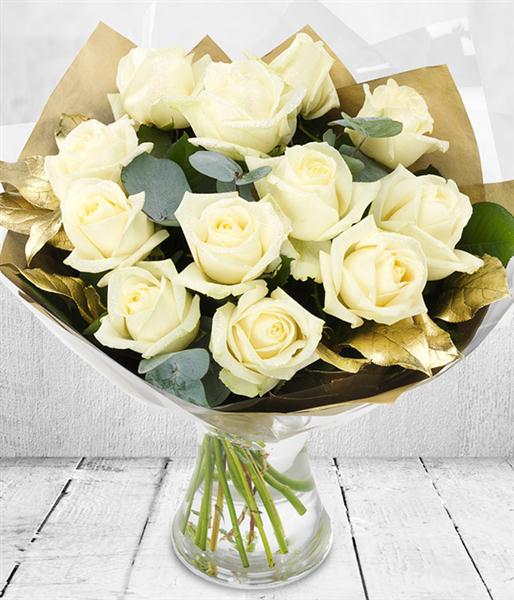A bouquet of 12 elegant white roses presented with gold foliage and topped with eucalyptus.