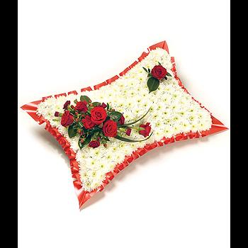 A classic white Chrysanthemum based pillow with ribbon edge. Featuring Roses, Carnations, Hypericum and complementary foliage.