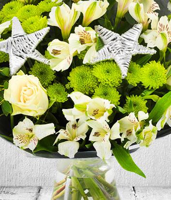 Gorgeous white roses, white alstroemeria and green chrysanthemums nestled with silver stars for that perfect festive feel.
