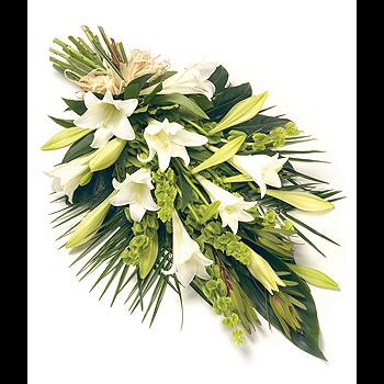 A classic white Lily hand tied sheaf. Longiflorum Lilies and an array of foliage tied with a natural raffia bow.